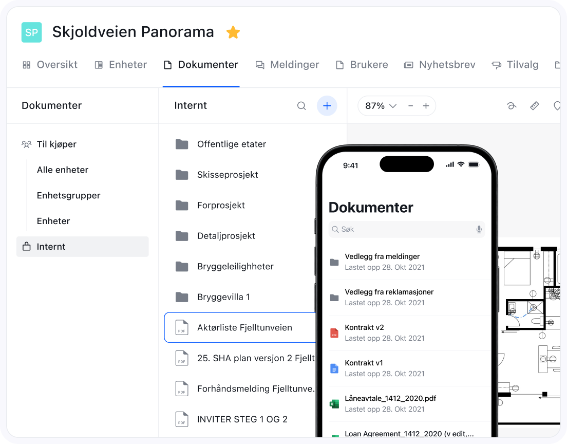 Vi vet att det är väldigt många olika dokument att hålla reda på i ett bostadsprojekt. I Journey kan alla parter enkelt spara, hantera och lägga upp dokument, antingen för intern användning eller för att dela det med kunder. Välj en ansvarig person som kontrollerar dokument innan de delas med kunder.