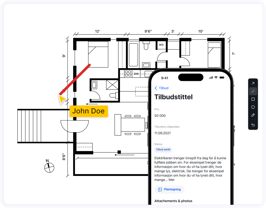 I Journey kan kunden enkelt rita, markera, skriva kommentarer på planlösningen och bifoga filer, för att på bästa möjliga sätt förklara sina önskade byggändringar. Kund och kundansvarig kan såklart även registrera önskemålen tillsammans.
