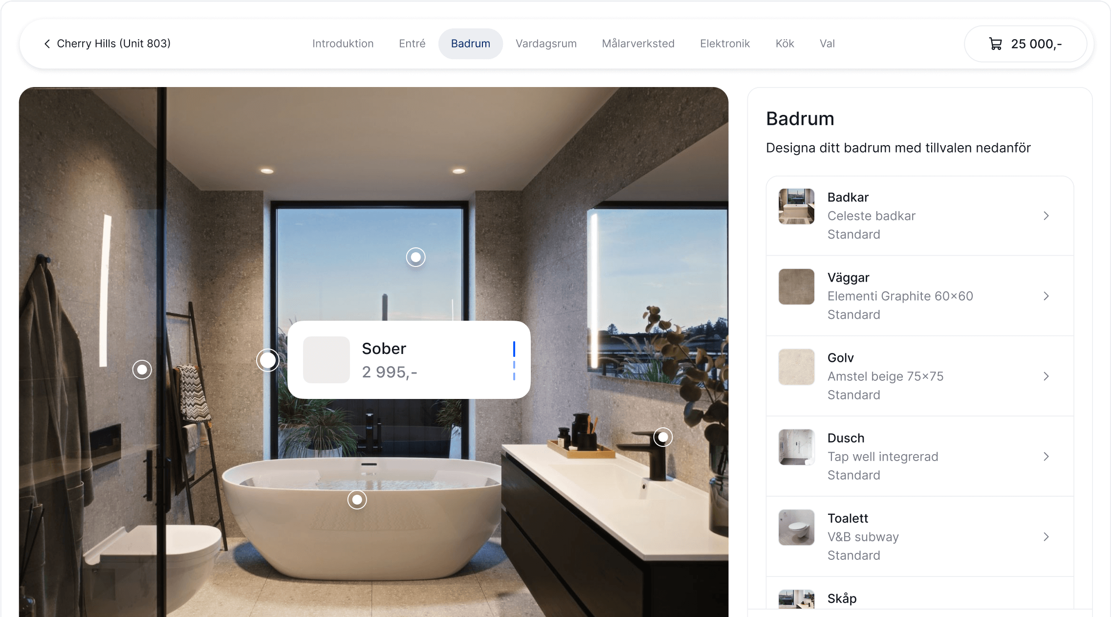 Genom att använda vårt digitala showroom i tillvalsprocessen ser vi att kunderna känner sig tryggare samtidigt som omsättningen på tillval ökar med ca 15%.
